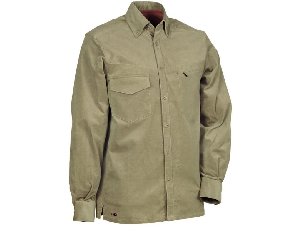 Pracovná košeľa značky Cofra s dlhým rukávom, jedným náprsným vreckom so skrytým YKK® zipsom a druhým vreckom na suchý zips, zapínaním na plastové gombíky vo farbe látky a golierom na gombíky. Má nastaviteľné manžety s dvojitým gombíkom, bočné rázporky a potnú pásku. Praktická a pohodlná na každodenné nosenie ako klasická pracovná košeľa.