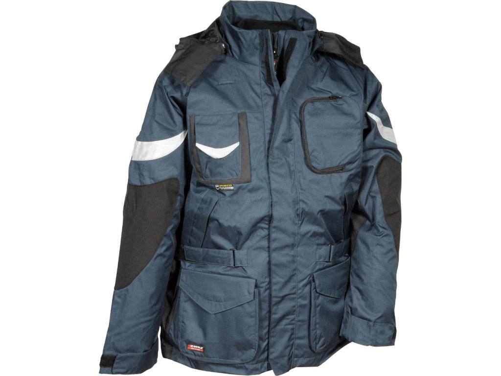 Zimná bunda značky Cofra s technickou výplňou, výbornou tepelnou izoláciou a zníženým objemom. Vetruodolná, vodeodolná a chladuvzdorná bunda vhodná do náročných pracovných podmienok. Má ergonomický strih, termo-zvárané švy a reflexné prvky pre vyššiu bezpečnosť. Ponúka 11 vonkajších vreciek, odnímateľnú kapucňu a rukávy, vrecko na mobil s E-WARD ochranou a zosilnené lakte pre maximálnu funkčnosť a komfort. Vhodná ako zimná pracovná bunda či voľnočasová zimná bunda.