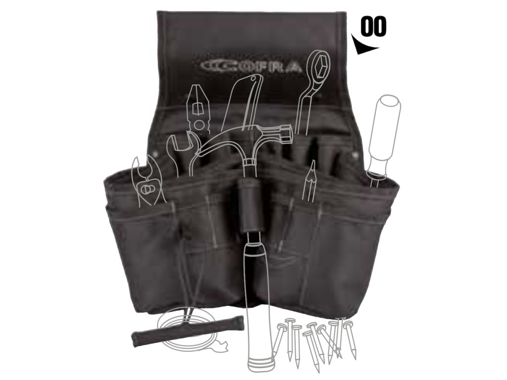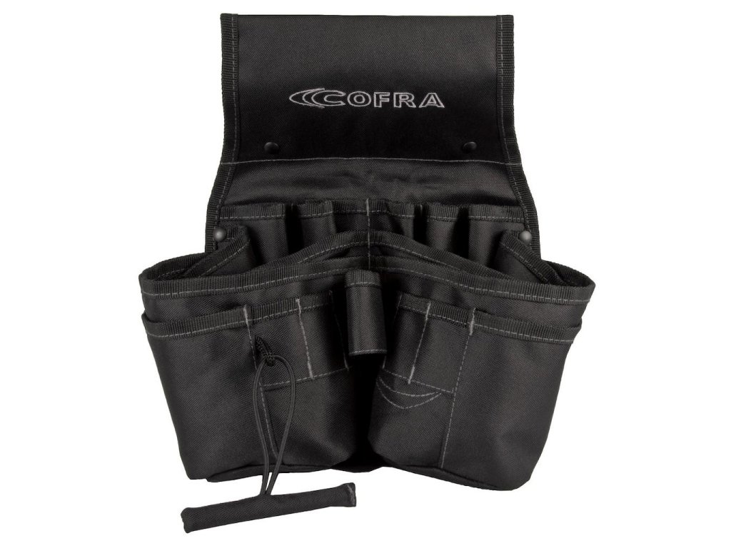 Široká tesárska brašňa značky Cofra z mimoriadne odolného nylonu so 4 širokými centrálnymi vreckami na klince a skrutky, 2 malými bočnými vreckami a textilným krúžkom na kladivo. Obsahuje držiak na lepiacu pásku, spodné vrecká a držiak na pero a skrutkovač. Spevnené švy a nity v namáhaných miestach zabezpečujú dlhú životnosť. Spoľahlivé uchytenie na akýkoľvek pracovný opasok.