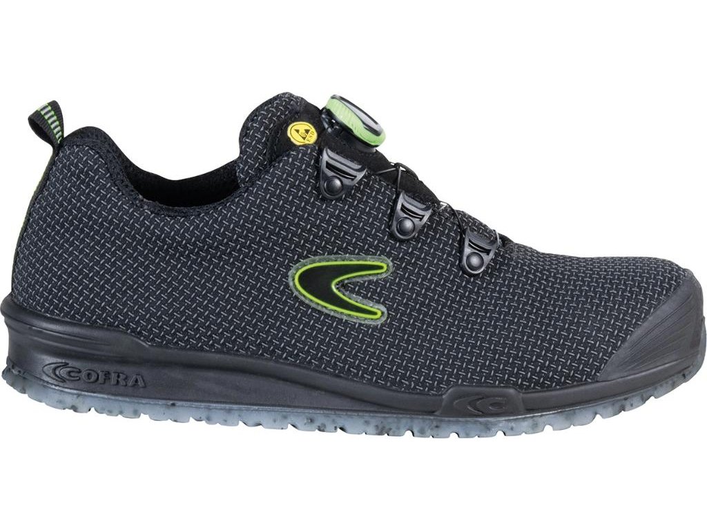 Bezpečnostná pracovná obuv značky Cofra v nízkom prevedení je vyrobená z odolnej, čiastočne ekologickej a voduodpudivej tkaniny TECHSHELL. Je doplnená o antistatickú ESD ochranu, hliníkovú špicu, protišmykovú podrážku odolnú proti olejom a dodatočnú ochranu prstov. Výhodou je rýchlošnúrovací BOA systém viazania, ktorý šetrí čas pri obúvaní. Túto obuv je možné doplniť o špecifické ortopedické vložky.