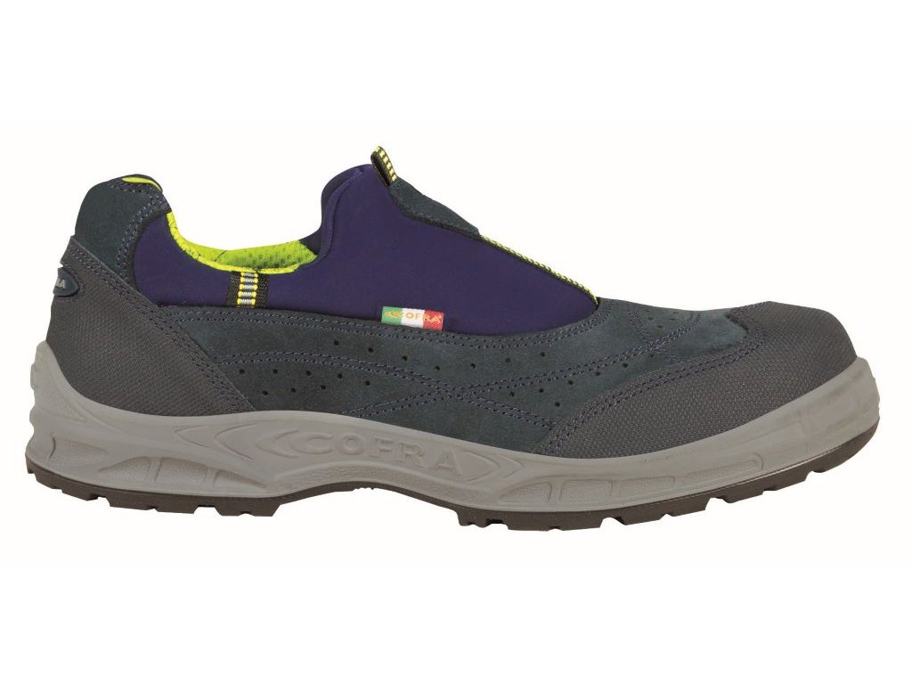 Bezpečnostná pracovná obuv značky Cofra v nízkom prevedení v podobe mokasín je vyrobená z pravej talianskej dierovanej kože typu semiš v spojení s technológiou LYCRA. Z bezpečnostného hľadiska je doplnená o protišmykovú podrážku odolnú proti prepichnutiu, sklolaminátovú (kompozitnú) špicu a antitorznú ochranu. Z praktického hľadiska je výhodou oderu a okopu odolná špica, ktorá chráni prednú časť topánky pred mechanickým poškodením.