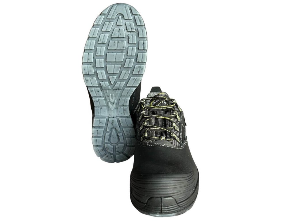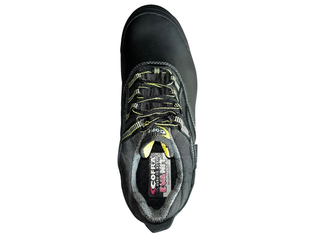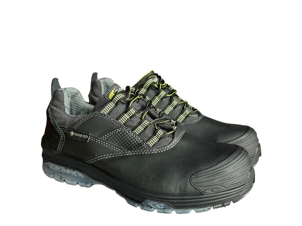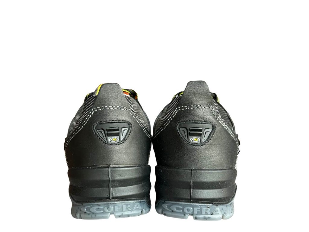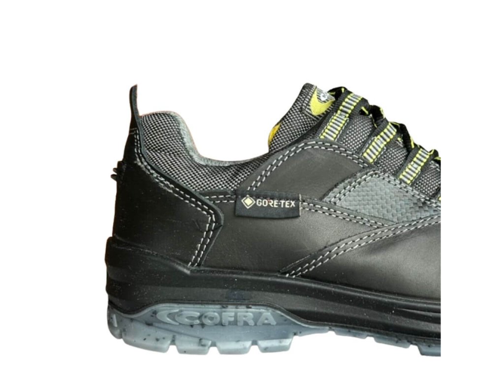 Nízka pracovná obuv značky Cofra v čiernej farbe je doplnená o GORE-TEX membránu, je vodeodolná, priedušná a výborne odoláva mechanickému poškodeniu. Je doplnená o bezpečnostné prvky, ako je napríklad kompozitná ochranná špica, protišmyková podrážka či antitorzná ochrana členka. Z praktického hľadiska je funkčným aspektom okopová špica v prednej časti topánky.