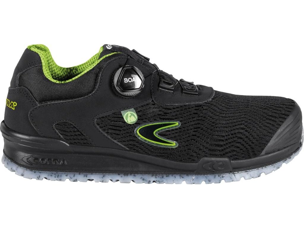Bezpečnostná pracovná obuv značky Cofra v nízkom prevedení je vyrobená z odolnej tkaniny a mikrovlákna. Je doplnená o antistatickú ESD ochranu, hliníkovú špicu, protišmykovú podrážku odolnú proti olejom a dodatočnú ochranu prstov. Výhodou je rýchlošnúrovací BOA systém viazania, ktorý šetrí čas pri obúvaní. Túto obuv je možné doplniť o špecifické ortopedické vložky.