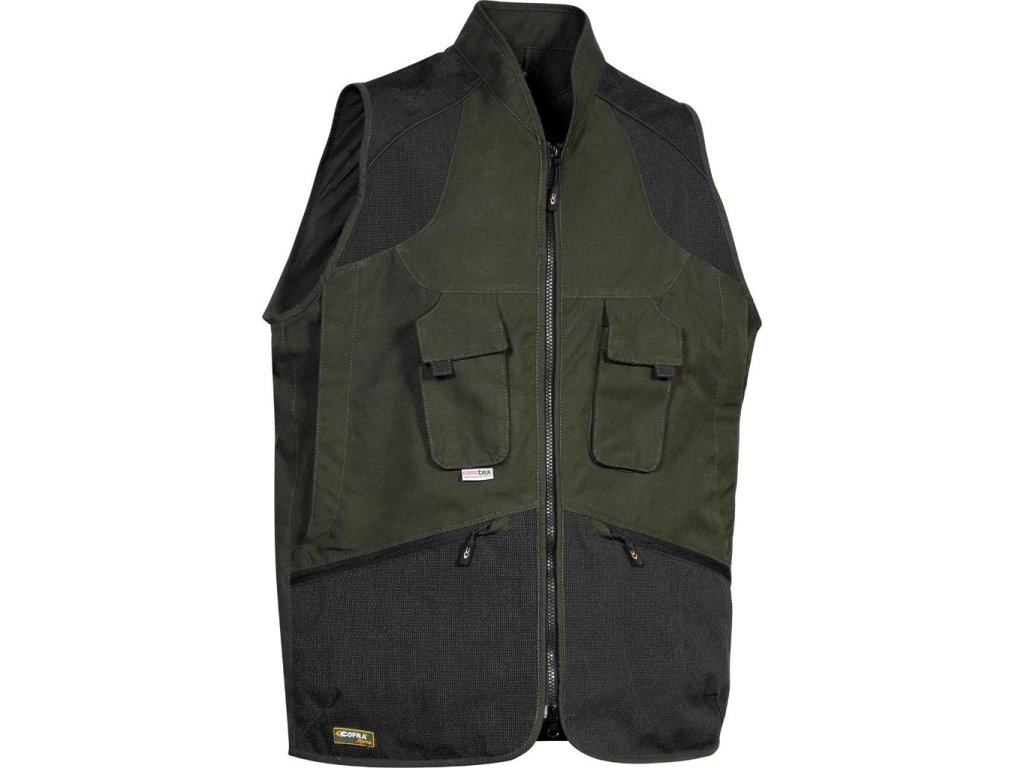 Univerzálna vesta značky Cofra je ideálna ako rybárska, poľovnícka, pracovná či outdoorová vesta na nosenie do prírody. Ponúka praktické vrecká na zips, vrátane kapsy na mobil, rádio a širokého zadného nepremokavého vrecka. Má odolné protioderové výstuhy na ramenách, sieťovanú podšívku a D-Ring pre príslušenstvo. Je vyrobená z priedušného a vodeodolného materiálu cofra-tex.