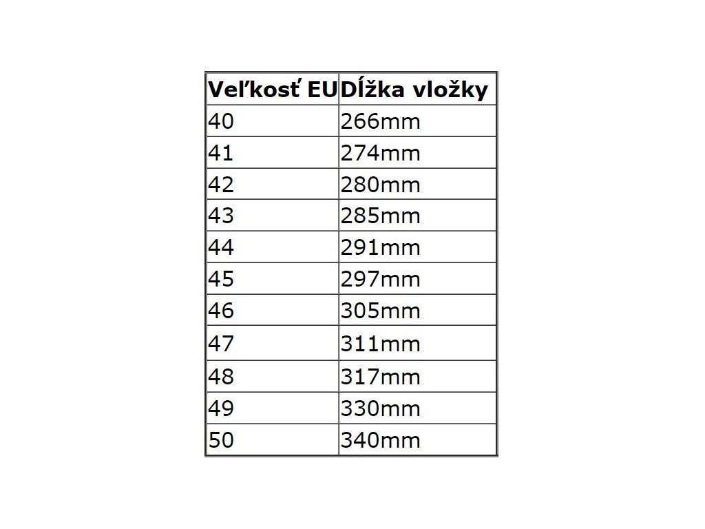 | Veľkosť EU | Dĺžka vložky |