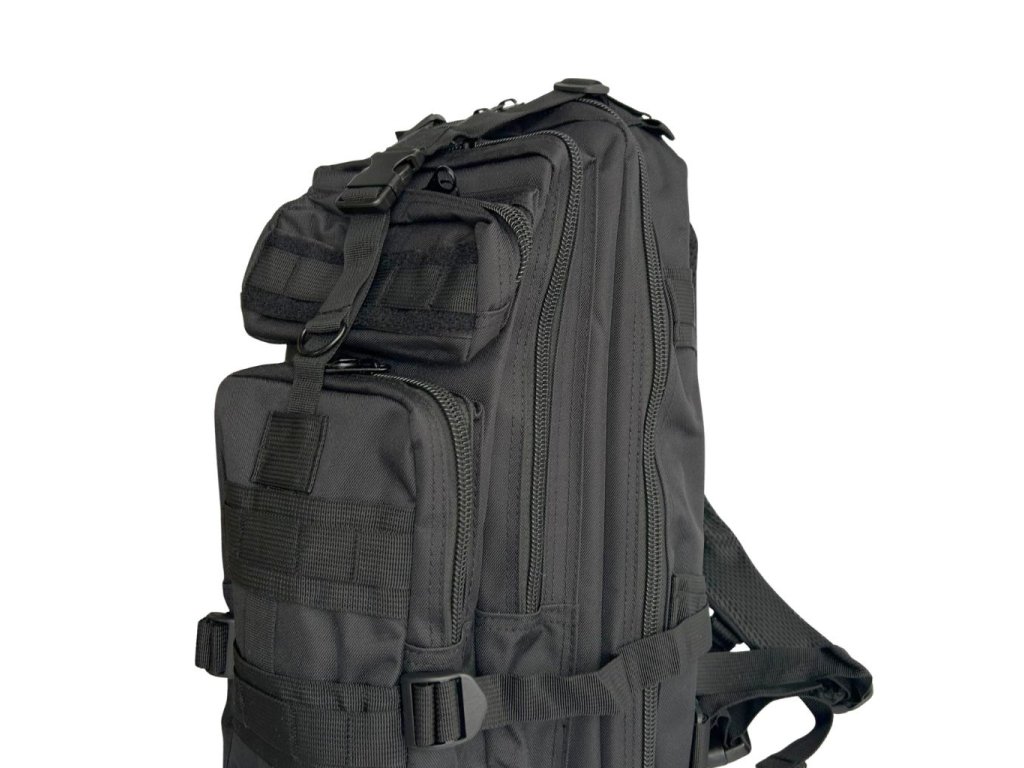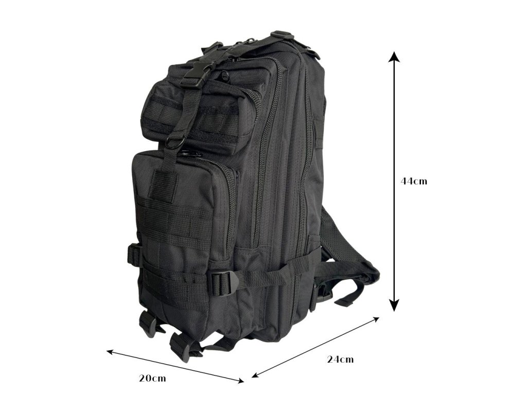 Turistický army čierny batoh 26L sa skladá z 5 hlavných priehradok. Hlavná komora disponuje zipsom, ktorý je potiahnutý až na dno, čo zaručí ľahké balenie a vybaľovanie veci. Vnútri je menšia kapsa na zips a sieťová priehradka. Druhá veľká komora vo vnútri ma dvojitú malú kapsu so všitou sieťovinou a ďalšími 2 priehradkami. Vnútorná malá kapsa. Vnútorný spodná, väčšia kapsa - obsahuje 2 malé kapsičky so sieťovinou a 5 priehradkami. Na vnútornej strane batohu je priehradka uzatvárateľná suchým zipsom, ktorá je ideálna pre hydratačný systém - tzv camelback (hydrovak-hydratačny vak).