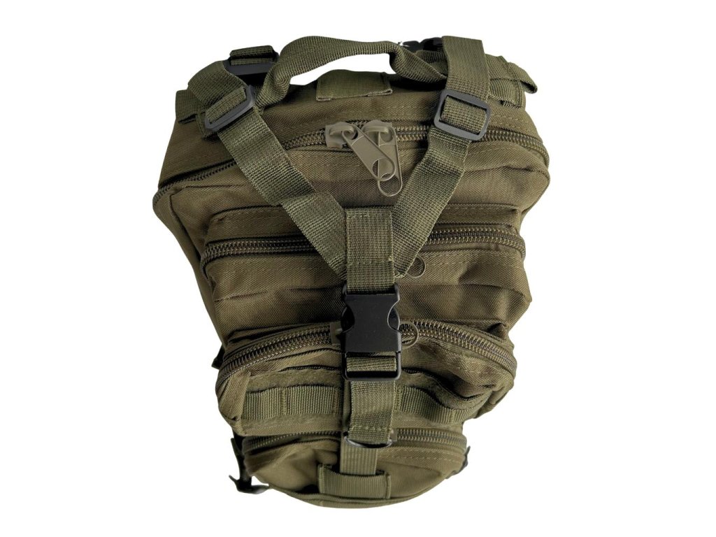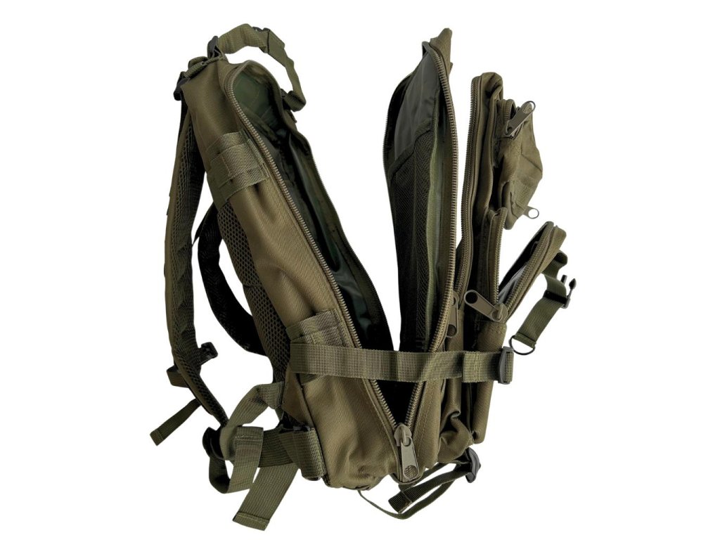 Turistický army zelený batoh 26L sa skladá z 5 hlavných priehradok. Hlavná komora disponuje zipsom, ktorý je potiahnutý až na dno, čo zaručí ľahké balenie a vybaľovanie veci. Vnútri je menšia kapsa na zips a sieťová priehradka. Druhá veľká komora vo vnútri ma dvojitú malú kapsu so všitou sieťovinou a ďalšími 2 priehradkami. Vnútorná malá kapsa. Vnútorný spodná, väčšia kapsa - obsahuje 2 malé kapsičky so sieťovinou a 5 priehradkami. Na vnútornej strane batohu je priehradka uzatvárateľná suchým zipsom, ktorá je ideálna pre hydratačný systém - tzv camelback (hydrovak-hydratačny vak).